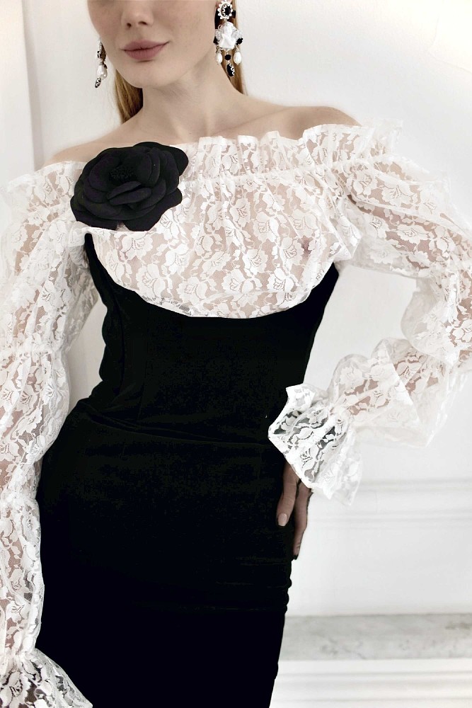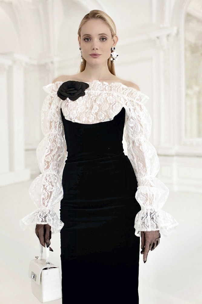 Ткани, использованные в коллекции, подчеркивают ее концепцию и придают особую изысканность каждому наряду. Бархат, с его роскошной текстурой и глубокими оттенками, создает эффектную основу для моделей, а кружево и фатин добавляют воздушности и нежности, создавая игру текстур и прозрачностей.