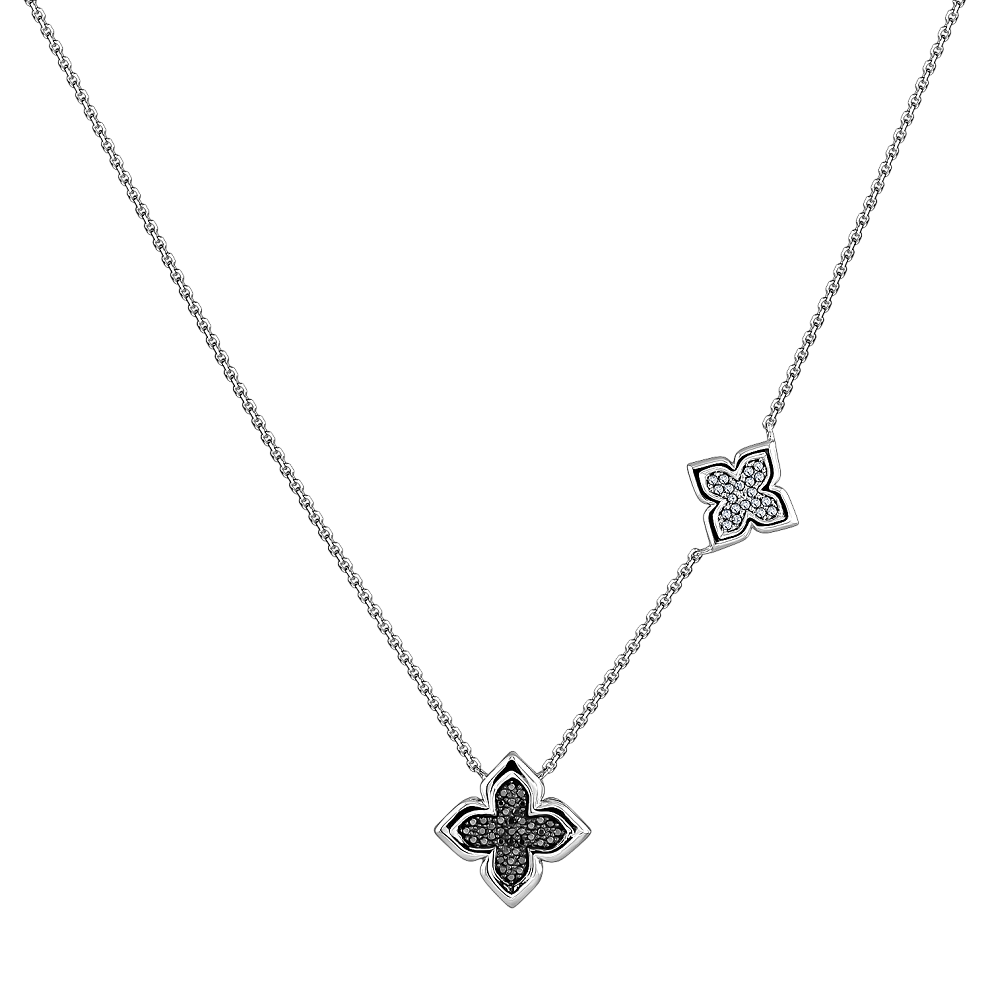 Такая игра контрастов всегда актуальна и в мире моды, а любимое сочетание полярных цветов точно создано для драгоценного сияния бриллиантов – окажись они в серьгах с парными четырехлистниками, или в колье, где цветки самого удачливого растения ассиметрично расположились на цепи якорного плетения.