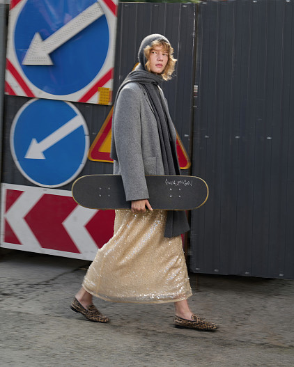 Осенняя коллекция 2023 — это баланс между праздничностью и повседневностью. Футболку из пайеток можно смело сочетать с хлопковой рубашкой и атласной юбкой, а юбку из пайеток — с шерстяным жакетом, и даже тотал-лук из экокожи может быть выбором для повседневных будней.