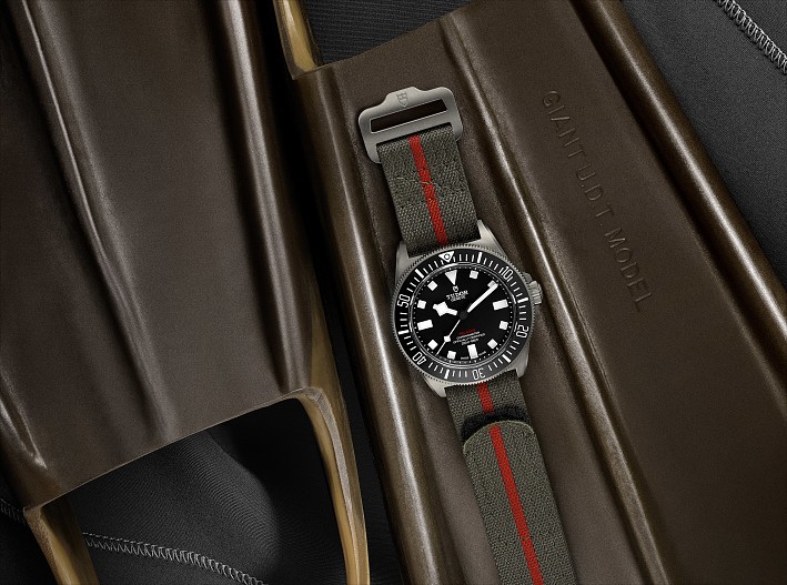 Традиционно дайверы ВМФ сами комплектовали свои часы TUDOR цельными ремешками из нейлона, черного или зеленого цвета. Модель Pelagos FXD, к которой прилагаются два ремешка, отсылает к военной традиции, согласно которой часы было принято носить на оригинальном ремешке, а не на стандартном браслете. В классической версии часы оснащены цельным текстильным ремешком травянисто-зеленого цвета с автоматической системой фиксации с вплетенной по центру красной нитью, а дополнительный цельный каучуковый ремешок темно-серого цвета с тисненым текстильным узором привносит нотки новизны в устоявшийся дизайн.