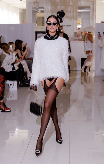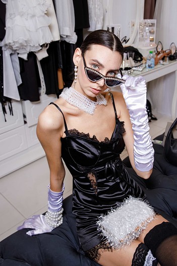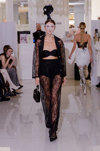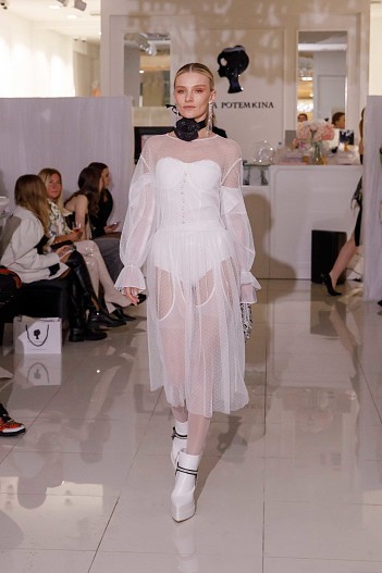 В этот вечер Белла Потёмкина представила свою коллекцию Belle Boudoir. По подиуму дефилировали модели в вечерних откровенных образах: шелковые боди с подтяжками, кружевные корсеты, прозрачные платья из органзы и фатина, летящие халаты, шляпы с перьями, роскошные аксессуары из страз и камней, королевские пряжки, жемчуг, бархат, лак... Коллекция очень смелая и даже неожиданная. Но публика, присутствующая на показе и наблюдающая онлайн, с восторгом встретила этот эксперимент в преддверии новогодних праздников и вечеринок.