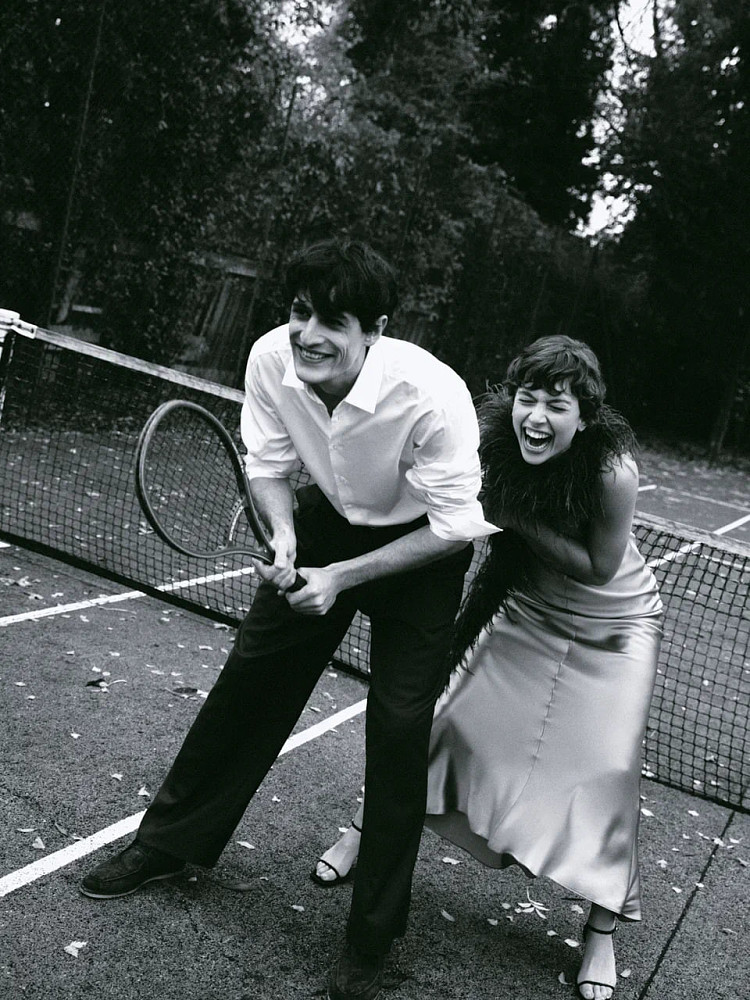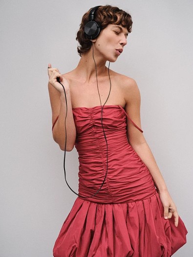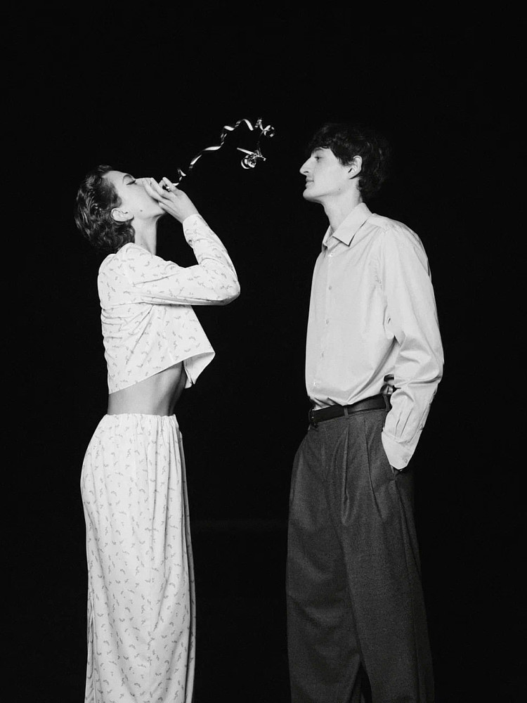 Бомберы из молочного твида и вязаные жакеты с перьями, брюки из лакированной кожи и платья из шуршащей тафты, комплекты с нежным цветочным принтом и платья из эластичного трикотажа, а для мужчин — бархатные бомберы, брюки и рубашки. За волшебство и настроение отвечают праздничные фактуры — пышные перья и шелк, сияющая тафта и зеркальный искусственный шелк, покрытая лаком натуральная кожа.