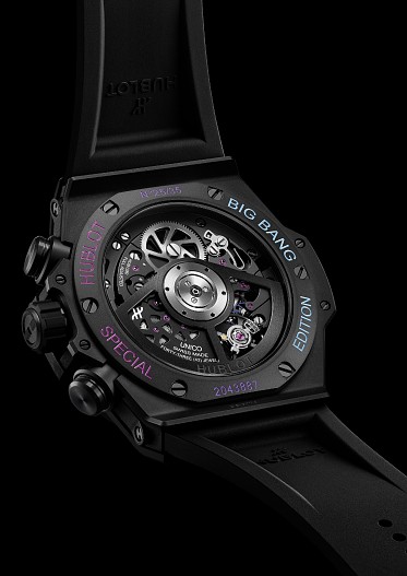Особенность модели — цветные акценты в дизайне циферблата, передающие все оттенки заката. Часы получили 42-миллиметровый корпус из полированной черной керамики, прошедшей пескоструйную обработку. В основе лежит собственный механизм Hublot Unico HUB1280. Запас хода составляет 72 часа. Водонепроницаемость корпуса — 100 метров. Гипоаллергенный и легкий материал, который принимает температуру тела, обеспечивает идеальный комфорт на запястье.