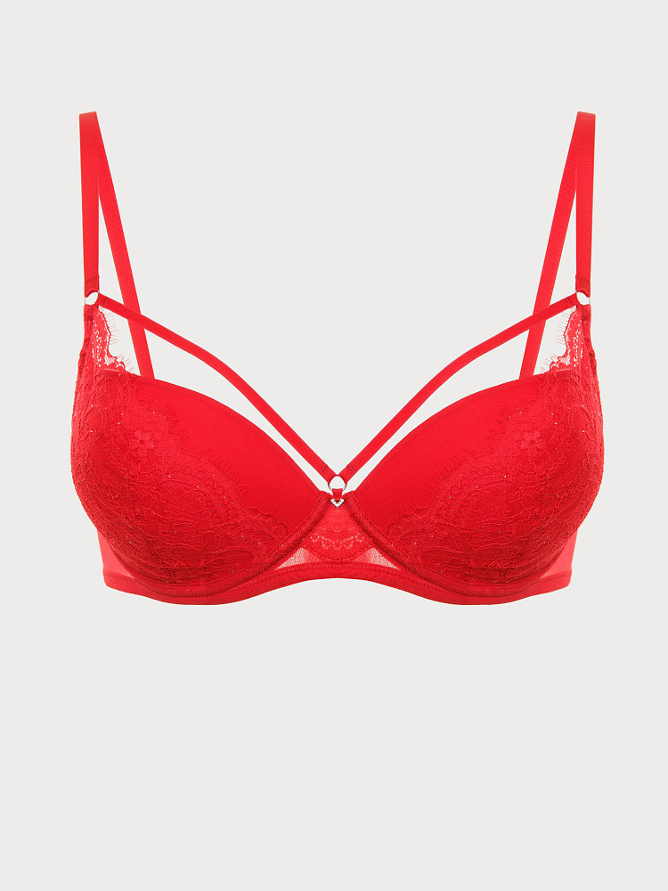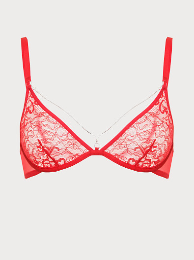 Пламенно-красные модели коллекции Fairy Love отличают необычные детали. Блестящие декоративные цепочки в декольте мягких бюстгальтеров. Тонкие ленточки, контрастирующие с белизной кожи или оттеняющие тон загара, в бюстгальтерах push-up.