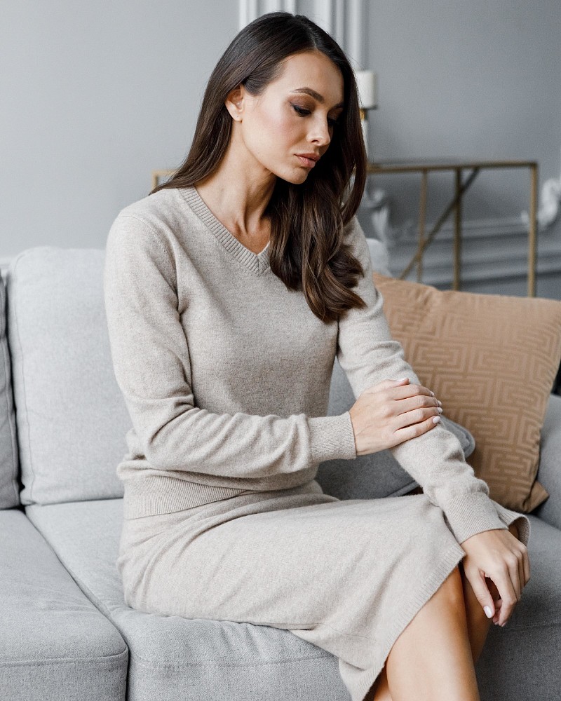 Стилисты ателье не обошли своим вниманием и девушек, дополнив коллекцию уютными и универсальными комплектами из кашемира, которые исполнены как в брючном варианте, так и в формате макси-юбок.