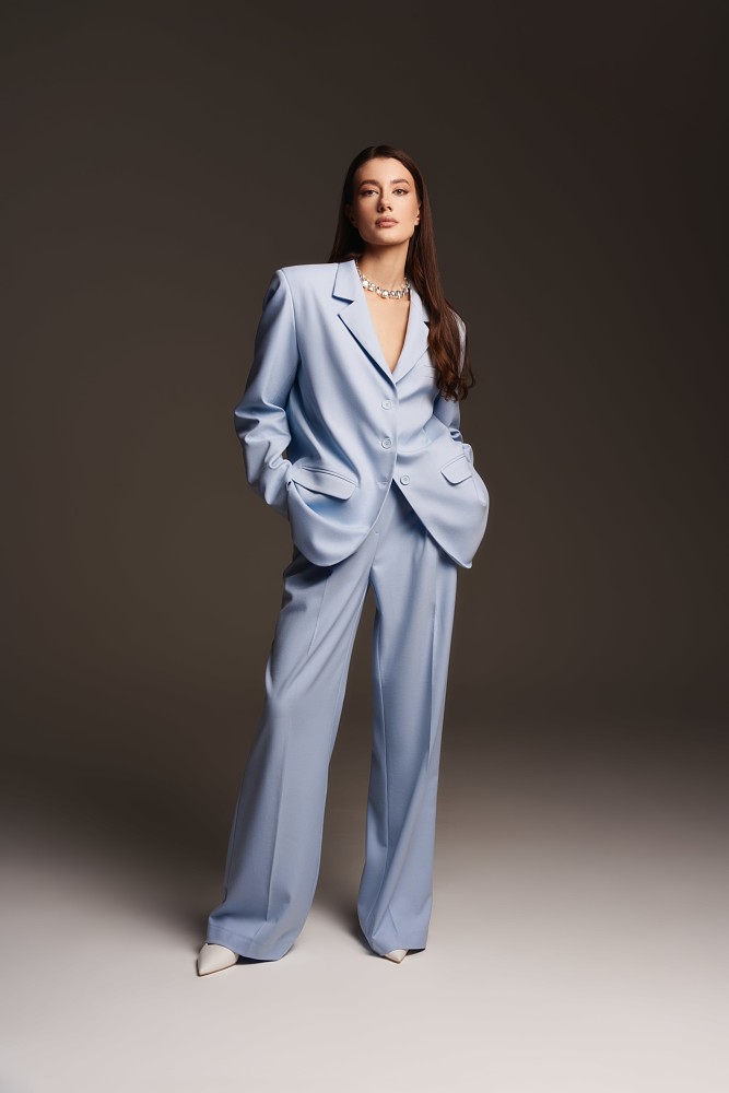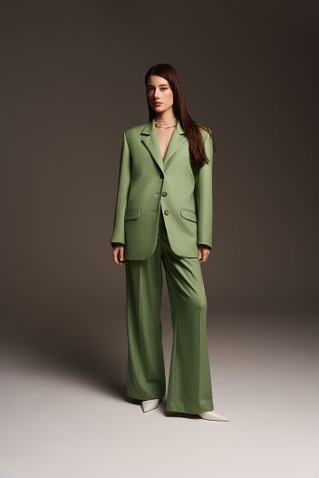 Среди новинок можно отметить брючный костюм Lucky, в котором идеально сочетается строгий жакет с мужского плеча и свободные брюки-палаццо.