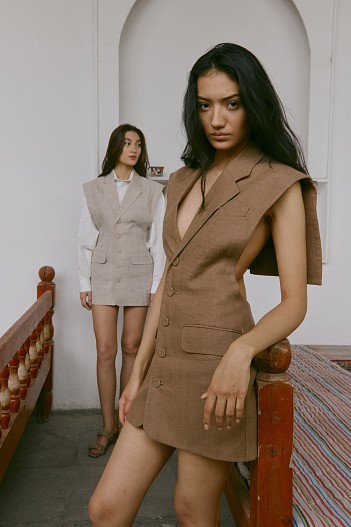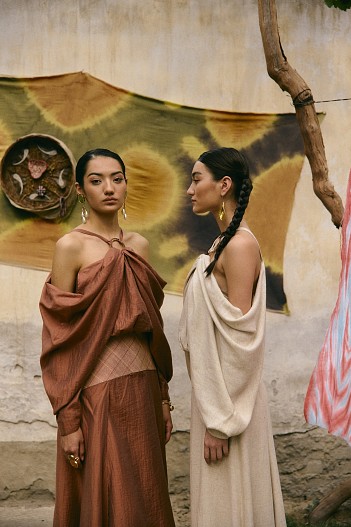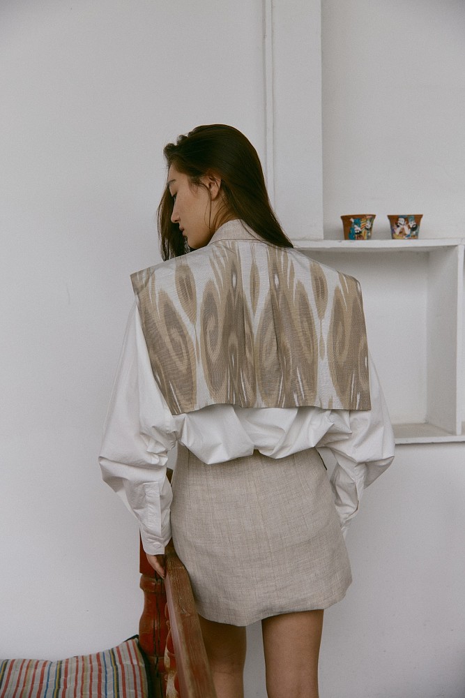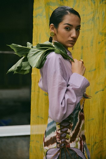 Помимо этих моделей, особое внимание в коллекции уделено этническим мотивам в совершенно разных изделиях из адраса - от тюрбанов и корсетов до рубашек и жакетов, идеально подходящих для нарядных, и в то же время легко адаптируемых для городской жизни, луков — в зависимости от случая. Для яркости образа можно обратиться к асимметричному топу с молочно-оранжевым узором и рубашкам с объемной спиной.