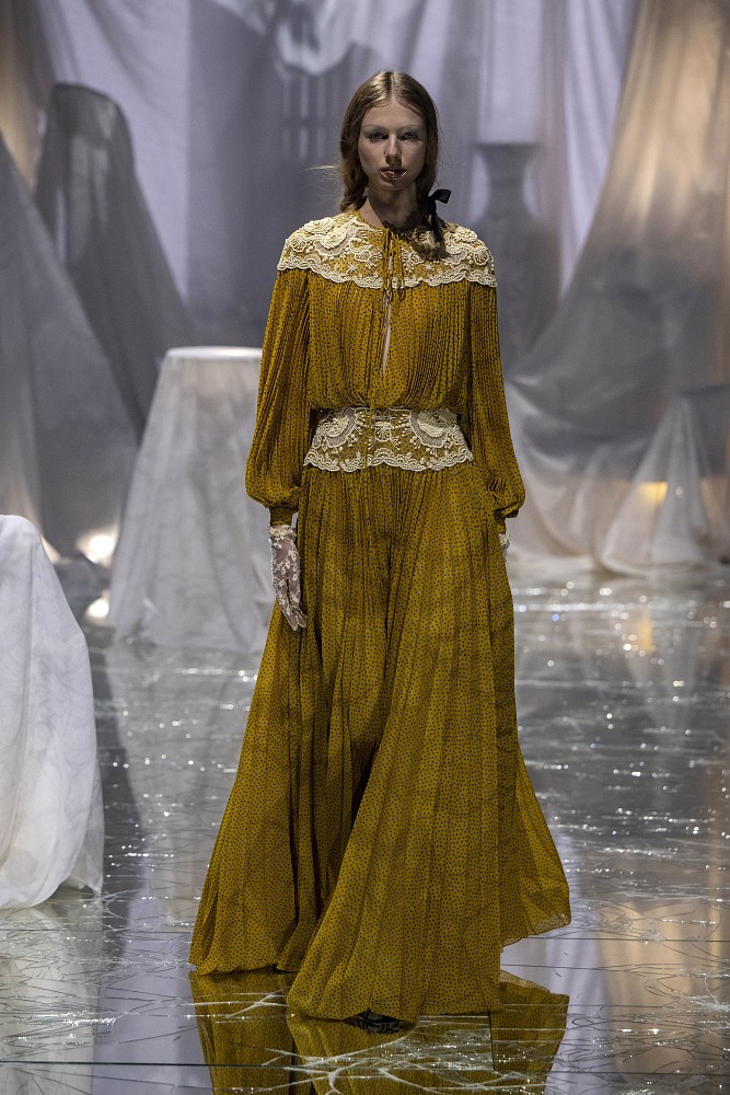 Алессандро искусно смешивает разных эпохи: от сумок с бахромой 60-х до платьев 30-х и украшений для лица 2020-х. Каждый образ был дополнен полным набором аксессуаров: широкополыми шляпами и тюрбанами, кружевными колготками, туфлями с бантиками и блестящими серьгами в стиле ар-деко. По мере развития шоу на нескольких языках звучала песня о том, как важно находить радость и счастье во всём — в том числе в красивых и замысловатых нарядах.