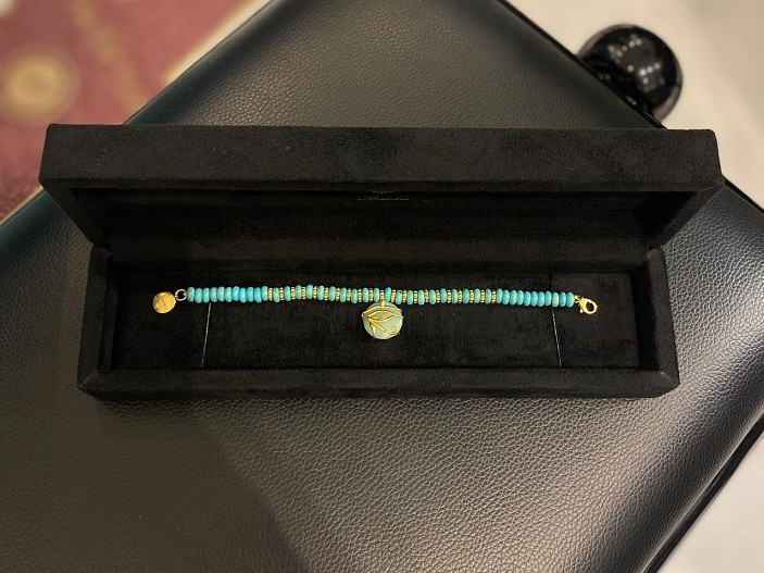 Художник-ювелир Диана Джанелли вдохновилась сюжетом из истории Древнего Египта — змеей, плывущий по водам Нила среди лилий. Образ лилий прослеживается в колье виде пяти цветов, украшенных изумрудной эмалью и природными аметистами, ограненными вручную специально для колье. Знаменитая кормящая река Нил изображена в виде подвижных линий из лазурита и африканского малахита, украшенных каплями из природной бирюзы и амазонита.