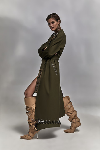 В женскую коллекцию также вошли стильные плащи в оттенках хаки и серый со шнуровкой по нижнему канту и металлическими декоративными элементами на лацканах.