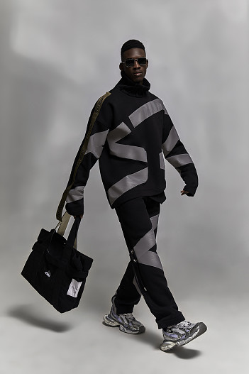 Дополнил дроп утепленный мужской костюм с асимметричным кроем и светоотражающими лентами и костюм с лентами и люверсами в модном оливковом оттенке и вышивкой в фирменном оранжевом цвете.