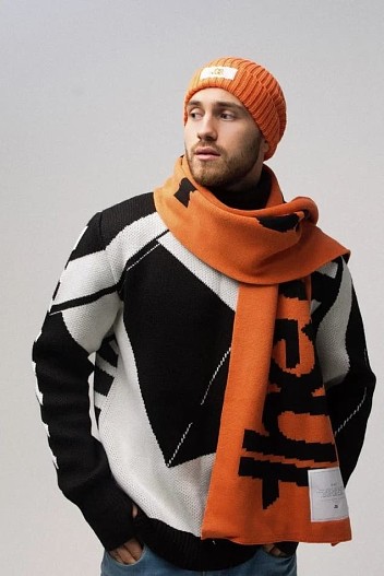 Сохранить тепло в зимний период помогут и фирменные аксессуары в черном, сером и оранжевом цветах. Широкий объемный шарф, связанный из нежной, теплой пряжи, и шапка из ткани в рубчик надежно защитят от ветра и холода.