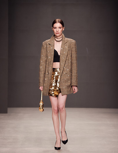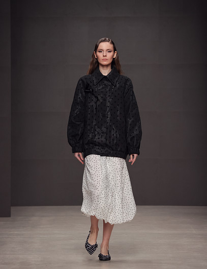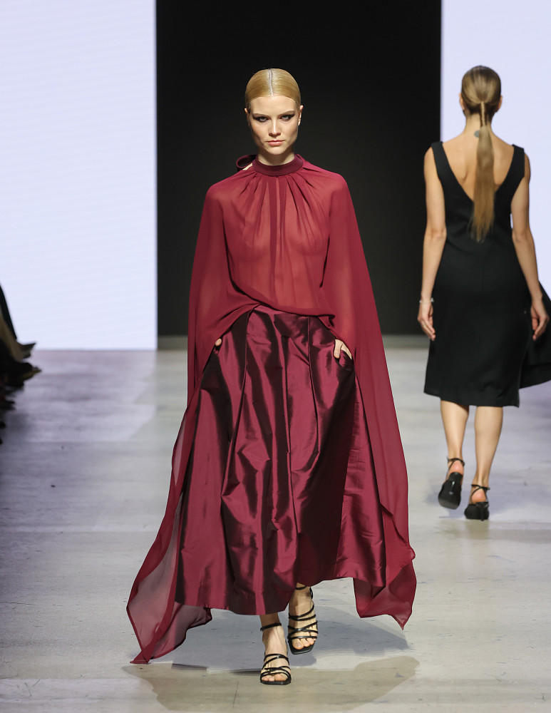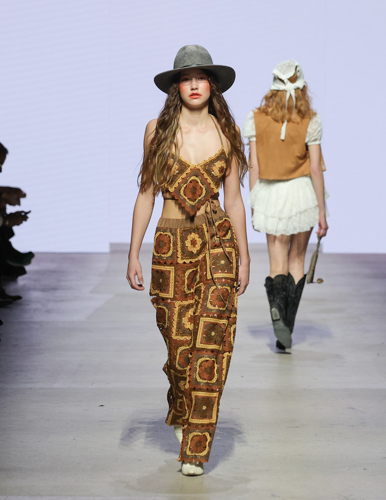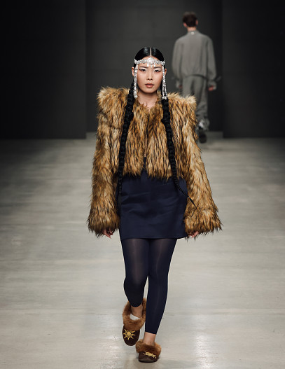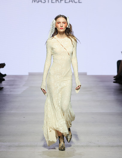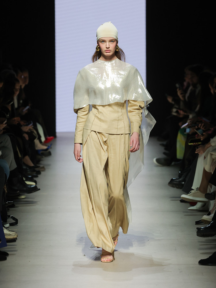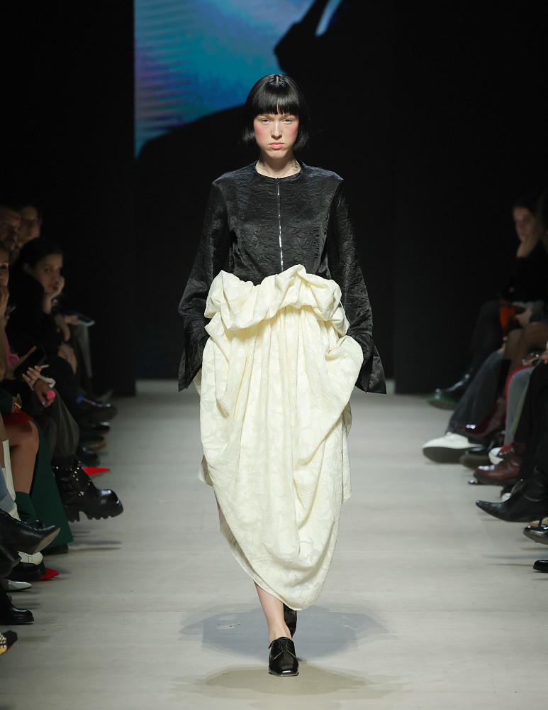 На подиуме зрители стали свидетелями «Танца льда» — именно так назвала новую коллекцию Изабелла Дордосова, дизайнер Inniki by Isabella Dordosova. Креативный директор модным образом решила перенести гостей показа в Якутию, откуда берет свое начало бренд, и погрузить в арктическую эстетику и архитектуру региона. Изделия таяли на глазах за счет характерных текстур, напоминающих «исчезающий» снег. Детали, словно замерзшие узоры, приглушенные оттенки графитового, шоколадного, пепельного, песочного, якутские орнаменты подчеркнули культурный код страны и стали символами рассвета новой весны.