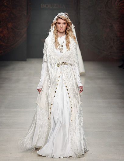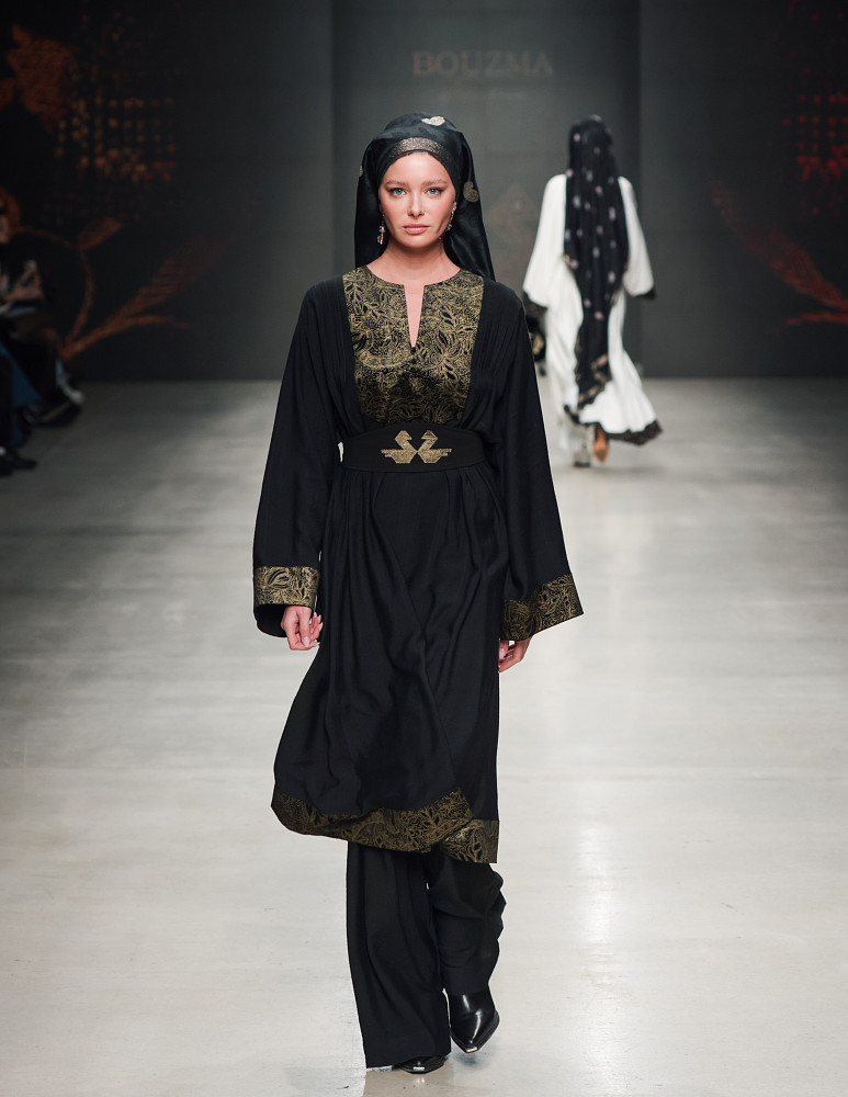 Майя Мамаева, создательница бренда Bouzma ethnique, через коллекцию «Переплетение времен» передала величественные пейзажи Махачкалы и богатое наследие горных народов. Главной особенностью капсулы стали этнические мотивы и традиционная одежда, которую можно носить даже в повседневной жизни. Зрители также увидели модернизированные оммажи на культовые бурки — их роль исполняли кейпы и накидки в темно-зеленой палитре. Пышные платья, украшенные поясом из монет, крупными камнями и вышивкой, выполненной вручную, изделия с узорами и фактурами, навеянными традиционными орнаментами Кавказа, благородные ткани и национальные головные уборы полностью погрузили гостей в «Переплетение времен».