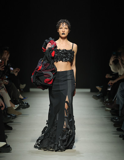 Кафедра дизайна Ивановского Политеха презентовала коллекцию, сочетающую в себе элементы народного и современного костюма. В представленной коллекции переплетены элементы стилей авангард, деконструктивизм, ар-деко, глэм-рок и урбанистический романтизм. Особого внимания заслуживают изделия с мягкой драпировкой и воланами, а также контрастные сочетания материалов и цветов – здесь полосатый принт в морской тематике соседствует с лаковой кожей глэм-рока, а винтажный деним и рваный черный плащ геометричного кроя с экспрессивной драпировкой создают визуальную симфонию форм.