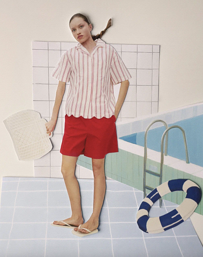 Спортивную винтажную эстетику дизайнеры выражают через принты. Непосредственный горошек и полоску, напоминающую линию дорожек, динамичную и устремленную вперед. Классическая клетка виши похожа на плитку бассейна. В моделях передана и мягкость воды. Она отражена через складки платьев и обработку краев в форме волн у рубашек и брюк. Спортивное настроение коллекции, стремление к свободе движения – через силуэты и форму поло.