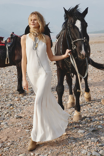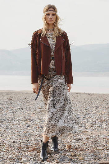 В женской линии — замшевые куртки и тренчи, струящиеся платья и юбки, сарафаны, льняные блузы с объемными рукавами и полупрозрачные ткани с легкими анималистичными принтами.