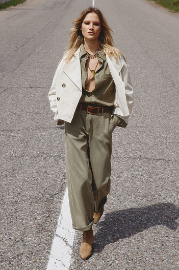 Летняя линейка создана для теплых дней, когда особенно хочется простора, легкости и романтики. Элементы сафари задают образам ритм. Замша, комбинезоны, хлопковые куртки и свободные силуэты — символ классической летней женственности.