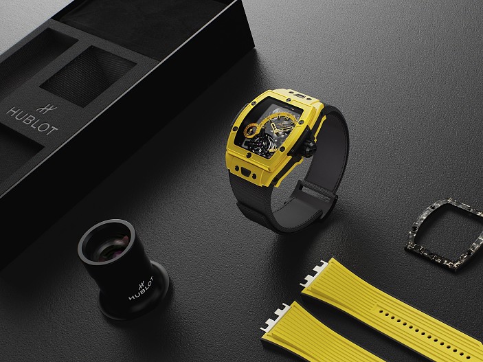 Коллекционеры могут выразить свою индивидуальность, выбрав один из четырех доступных цветов: красный, желтый, небесно-голубой и черный. Четыре ярких, оптимистичных, позитивных и блистательных характера создают неповторимую индивидуальность, в основе которой лежит калибр HUB6020 с ручным заводом и турбийоном, рассмотреть который можно на отметке «6 часов».