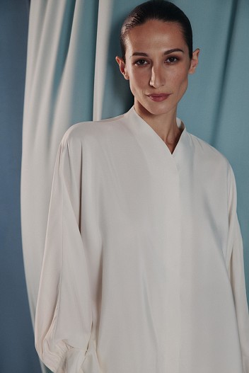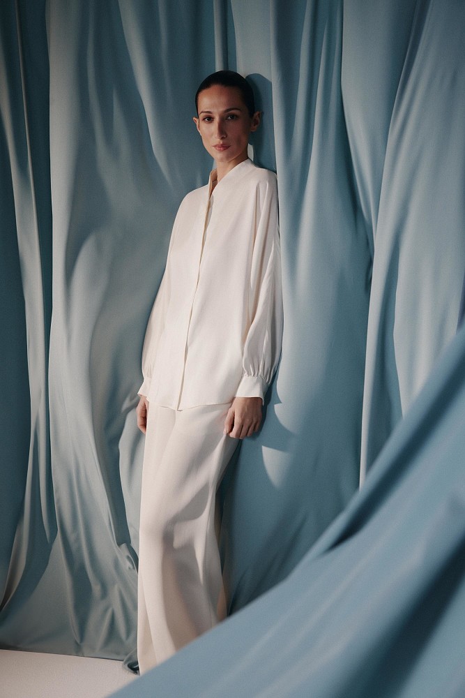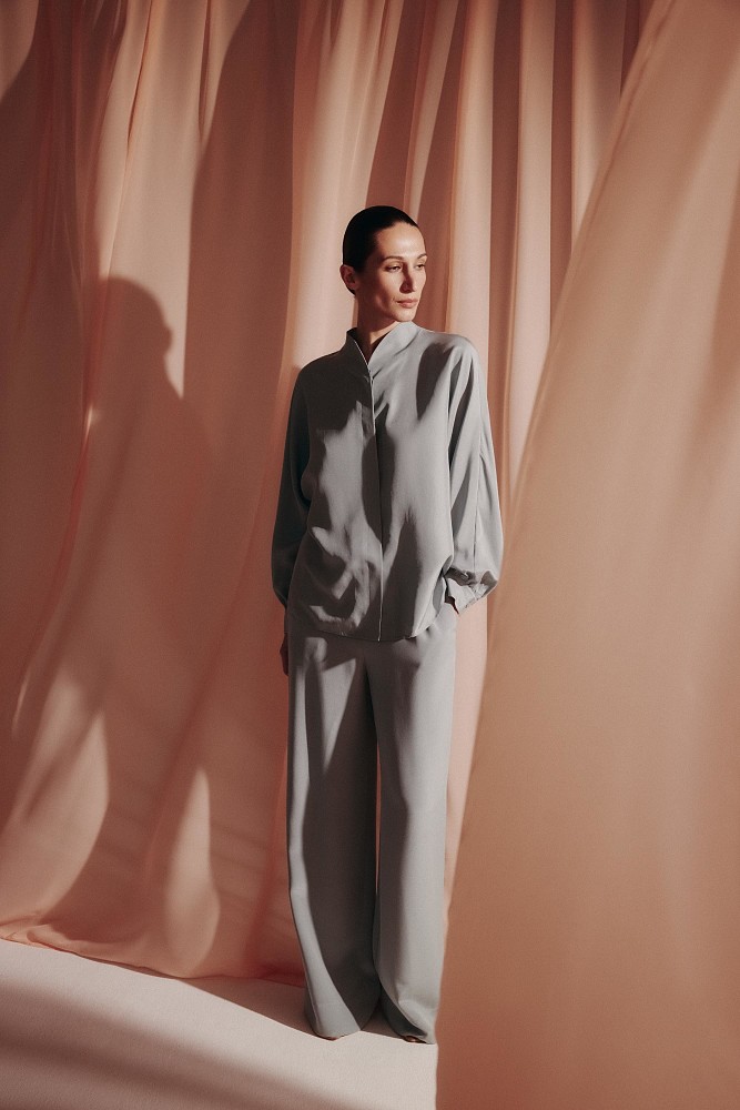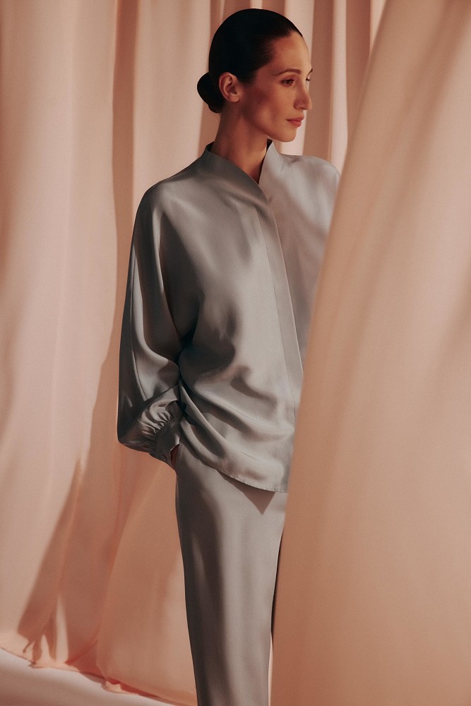 Среди моделей — блузка с высоким воротником и свободные брюки, которые хорошо держат форму. Лаконичные и простые, оба изделия создают комфортный закрытый силуэт без лишних деталей. Для комплекта Alice Blue был выбран шелк серо-голубого оттенка, напоминающий мираж в жаркой пустыне. Этот материал приятно скользит по коже, создавая ощущение легкой прохлады и невесомости. Комплект также доступен в цвете Ecru — это оттенок необработанного шелка, близкий к молочному.