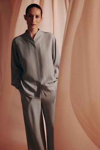 Команда бренда впервые использует шелк с обработкой Sand Wash, при которой ткань мягко «состаривают» в специальной среде с мелкими абразивами. Материал много раз промывают, снимают излишний блеск и деликатно «раскрывают» волокно. Шелк становится более мягким и пластичным, а его блеск — приглушенным и матовым.