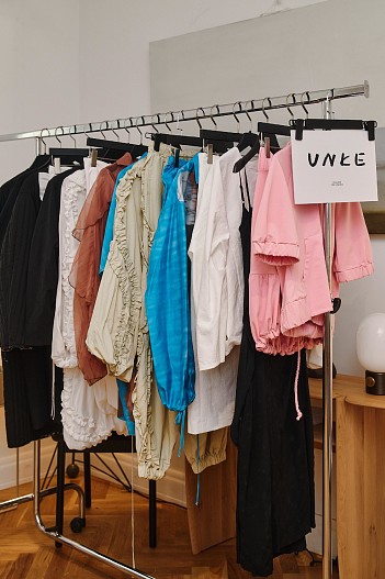UNKE – молодой бренд из Твери – показал коллекцию «Отражение», которая исследует преломление формы и цвета в поверхности воды. Этим вдохновлены основные приемы коллекции. В формообразовании бренд ищет способы, как верх и низ, разные стороны вещи могут отражать друг друга, но с искажением. Цветовая палитра коллекции – насыщенные, но сложные живописные оттенки лета и цвета водной поверхности. Принты изображают отраженные и преломленные в воде объекты – солнце, цветы, самого человека.