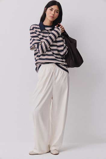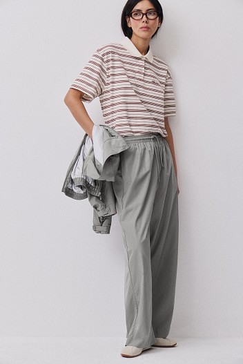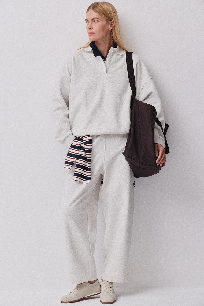 Гладкий плотный футер формирует комфортную основу капсулы. Из него выполнены толстовка-поло и укороченные брюки расслабленного силуэта — альтернатива джогерам в более собранном прочтении. Материал держит форму, остается мягким к телу и подходит для активного дня. Модели легко носить вместе или сочетать с плащевой верхней одеждой, собирая продуманный комплект на каждый день.