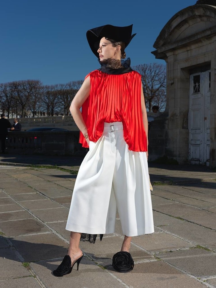 Ксения выбрала очень эффектный образ: алая блуза с плиссировкой и кружевной черной вуалью, белые кюлоты, мюли с розой и винтажная сумка Dior Saddle Bag. Но главным акцентом образа стала эффектная шляпа с широкими полями. Драматичная, немного театральная деталь, которая мгновенно притянула все взгляды.
