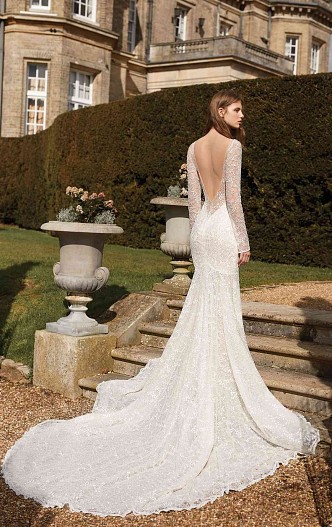 Глубокий V-образный вырез – но не спереди, а сзади – можно встретить во многих коллекциях. Ищите у брендов Galia Lahav, Ines di Santo. Смелый V-образный вырез вполне гармонично дополняет как классические свадебные платья, так и кружевные модели. Как правило, подобный вырез сзади предполагает достаточно закрытую модель спереди.