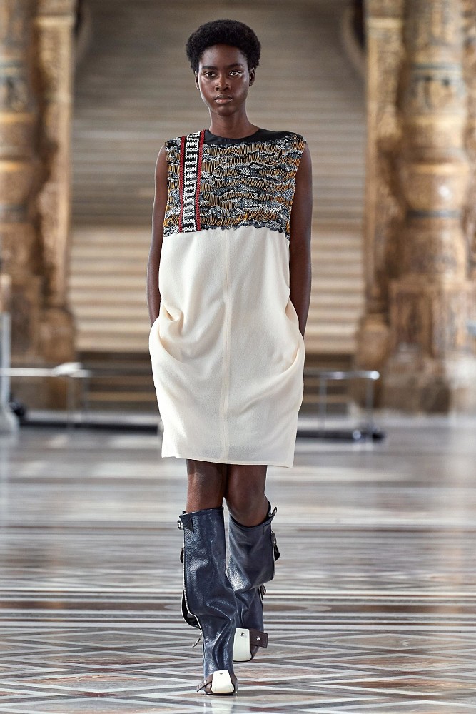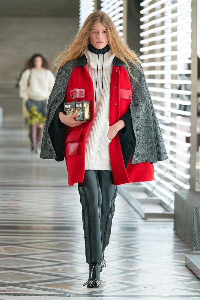 В то же время эта коллекция была демонстрацией мастерства ателье LV: инкрустированные драгоценными камнями туники выглядывали из-под парок и бомберов с цветными блоками, а простые платья 60-х годов в форме трапеции были тщательно вышиты графическими узорами.