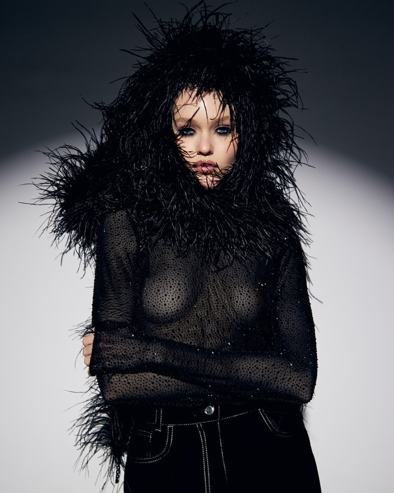 Особенной стала капсула из серой костюмной ткани. Лаконичные изделия дополнены россыпью сияющих камней и перьями страуса. Получилось с одной стороны очень зажигательно и завораживающе, с другой — строго и дорого.