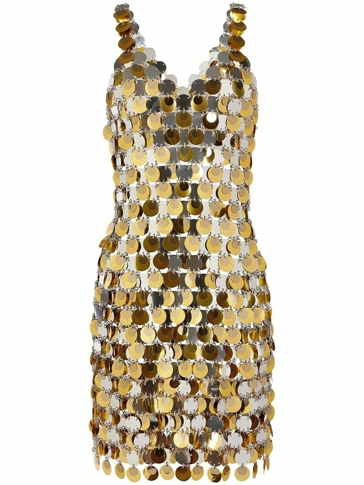 Золотое мини-платье с отделкой в виде кольчуги и пайеток – это настоящее произведение искусства от Paco Rabanne. Металлический блеск и классический силуэт создают образ современной богини. Платье подойдет для тех, кто не боится быть в центре внимания и готов встретить Новый год как настоящая королева вечеринки.