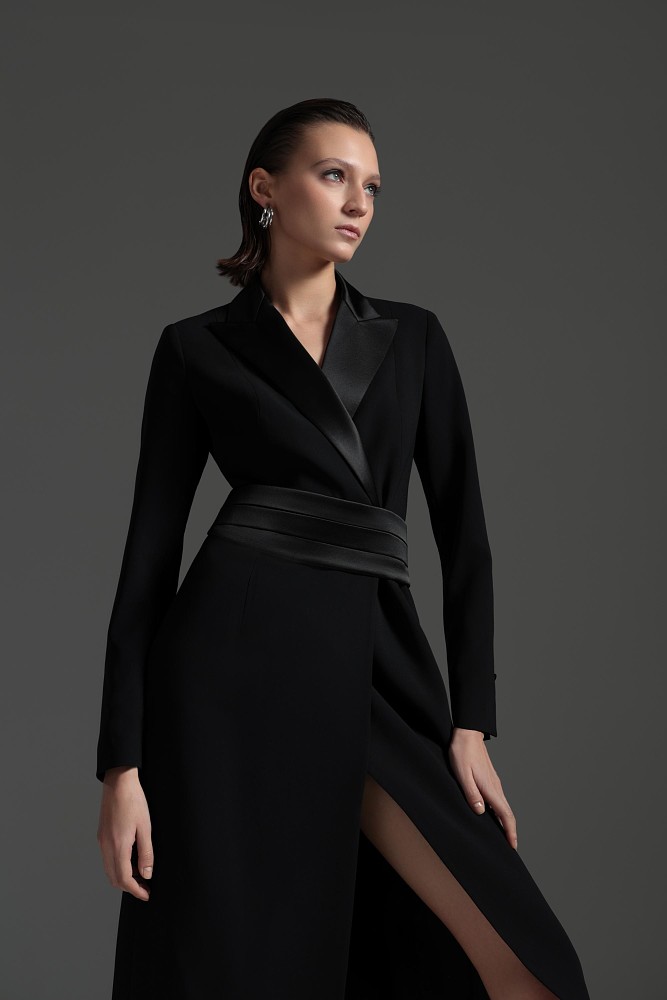 Платья изготовлены из высококачественных материалов, таких как атлас, шелк и кружево, обеспечивающих сочетание роскоши и комфорта. Блестящие элементы, включая пайетки и стразы, придают моделям ослепительное сияние, создавая запоминающиеся образы. Цветовая гамма коллекции включает серебро, символизирующее утонченность, золото — воплощение успеха, строгий черный, глубокий винный и свежий белый цвета, каждый из которых добавляет особое настроение наряду.
