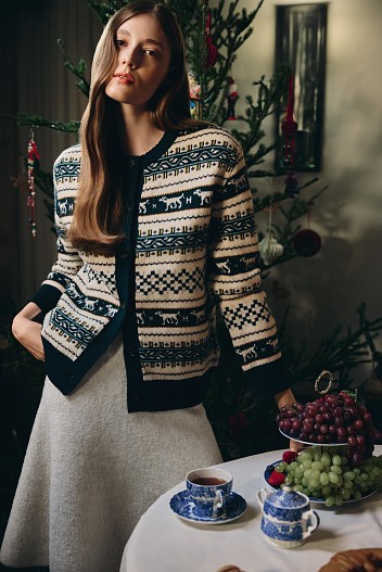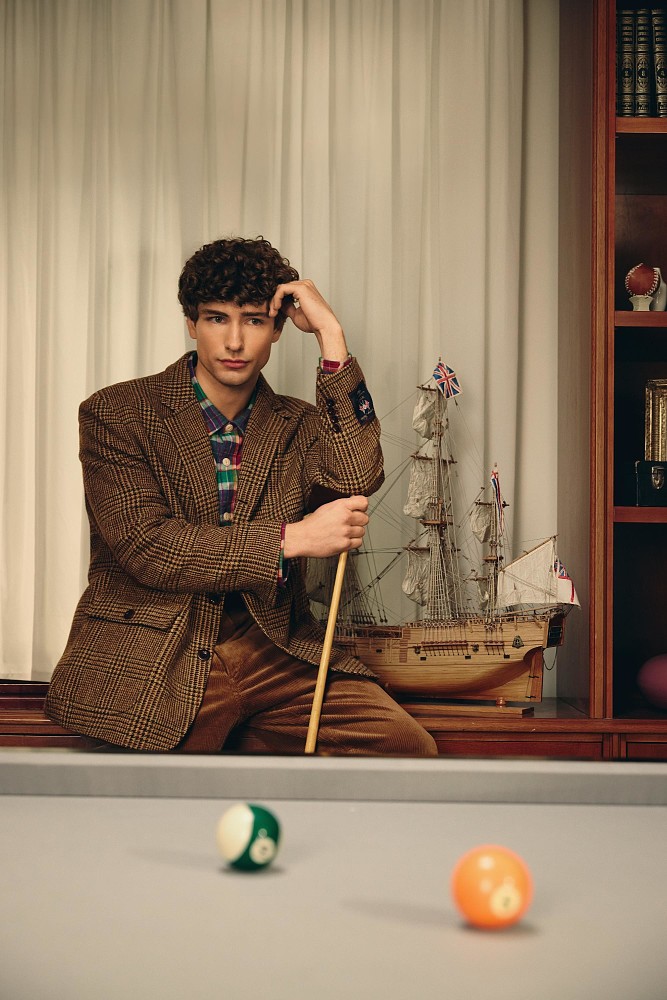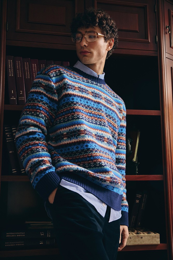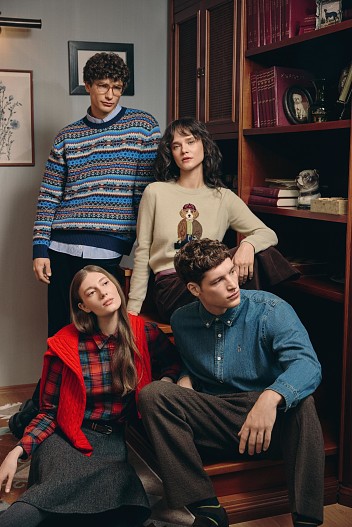 Коллекция включает джемперы и кардиганы из натуральной шерсти, уютные рубашки в клетку his for her и аксессуары — шарфы и панамы с фактурным плетением cable knit. Праздничное настроение задают рождественские мотивы с орнаментом в стиле Après-ski. Пойнтер, ставший одним из героев съемки является не только символом бренда, но и воплощением глубокой верности традициям и ценностям. Он олицетворяет единство и поддержку, которые мы находим в семье и близких. Образ пойнтера Гарри нашел свое отображение в коллекции бренда — на джемперах, толстовках и в знаковой вышивке.