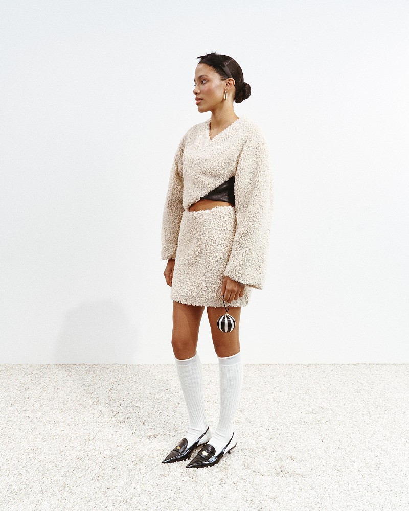 В новогоднем дропе бренд показал готовые праздничные образы, состоящие из юбок, свитшотов, жакетов и сумок.