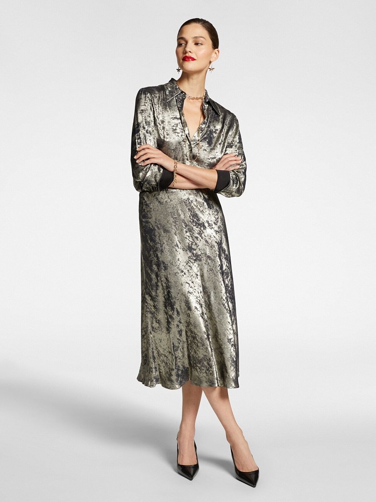 В новогоднюю ночь правит бал серебро. Изысканные платья, юбки и блузки в серебристом и черном цветах, из металлизированной ткани, с бахромой, пайетками и люрексом.