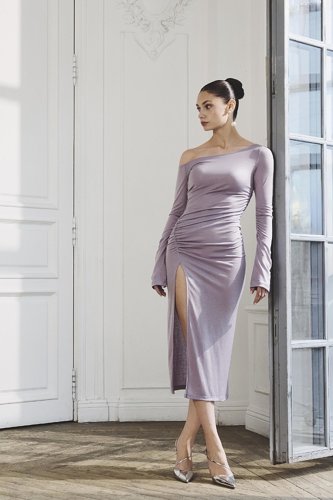 Также однозначно привлечет внимание своей яркостью струящееся лимонное или сиреневое платье прилегающего силуэта в длине миди с асимметричным верхом и кокетливым разрезом по ноге.