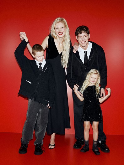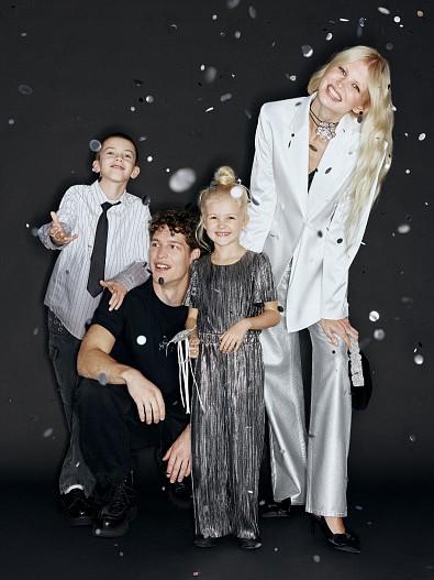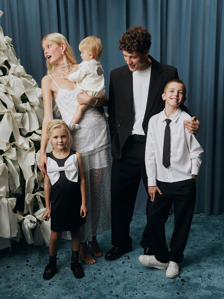 Элегантные образы в стиле black tie подойдут для предновогодних походов в театр или официальных мероприятий. Свежий взгляд на классические вещи: замшевое худи и белая рубашка для папы, вечернее платье с бархатными бантами для мамы и маленькая сумочка как завершающий штрих.