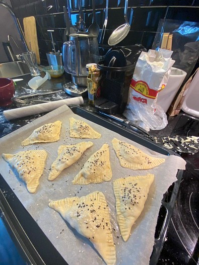 Пирожки выкладываем на противень, застеленный пергаментом. Отправляем в духовку 180 градусов на 30 мин.