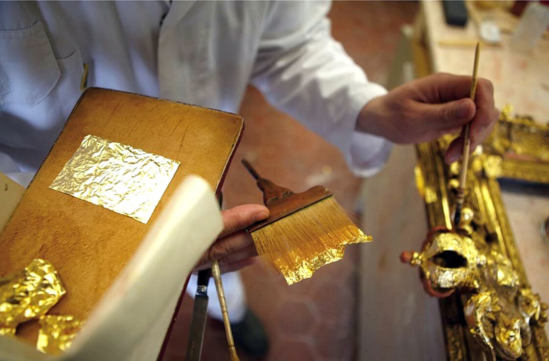Сусальное золото покрывает 893 квадратных метра убранства зрительного зала. Для золочения использовалось сусальное золото 960-й пробы, которое выпускается в виде листов. Листы золота уложены в книжки из папиросной бумаги. Вес тысячи листов составляет всего 24 грамма. К примеру, для золочения главной люстры потребовалось около 200 подобных золотых книжек. Зрительный зал украшают позолоченные элементы из папье-маше.