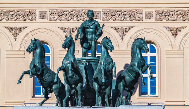 Фронтон театра украшает четверка лошадей, запряженная в колесницу под управлением покровителя искусств Аполлона. Во время реконструкции Большого театра Аполлон, управляющий квадригой, прикрыл наготу фиговым листком, хотя даже в советское время он гордо управлял квадригой в одном плаще. Говорят, что художники-реставраторы лишь вернули историческую достоверность скульптуре авторства Петра Клодта. Мол, листок был там и раньше, просто его снесло во время бомбардировки Москвы. Удивительно, что на сторублевой купюре, которую украшает изображение Большого театра, никакого листочка нет и в помине. Уже потянулись за кошельком, чтобы проверить?