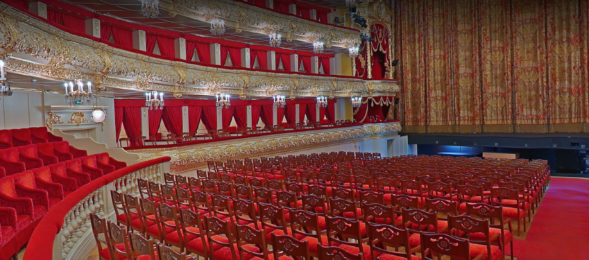 Виртуальный тур по Исторической и Новой сценам Большого театра — шанс попасть в театр из любой точки планеты. Помещения театра сняты с использованием техники сферических панорам. Обзор можно совершать на 360 градусов, можно приближать и отдалять картинку. Например, рассмотреть все ручки или вышивку на занавесе. Создается полное ощущение реального присутствия. Прогуляться в режиме онлайн по всем этажам Исторической и Новой сцен, рассмотреть в деталях императорские фойе, зайти в ложи и даже постоять на знаменитой сцене Большого театра! Во время виртуального тура можно заглянуть на верхнюю репетиционную сцену, где проходят репетиции оперных и балетных спектаклей. Там же можно пройти через оркестровую яму и понять, как видят спектакль дирижер и музыканты оркестра.