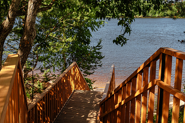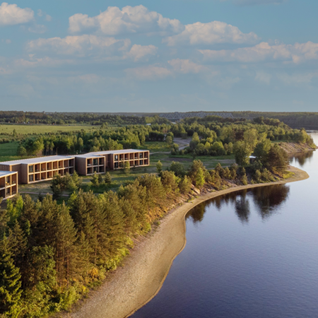 Отель расположился на выразительном берегу судоходной реки Свири, соединяющей Ладожское и Онежское озера. Все 50 номеров смотрят на изгиб реки, а лестничные холлы и обходные галереи отеля наполняют пространство сложными тенями. Здесь потрясающие закаты и ужины с бокалом южного вина. А летом можно попробовать сезонное Петровское меню с любимыми блюдами императора.