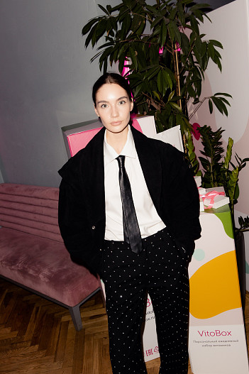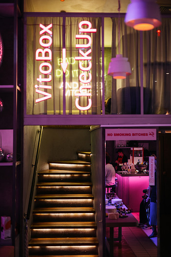 На входе гостей встречала тележка из сахарной ваты и попкорна, наверху в Yellow Room можно было пройти check up с нутрициологом бренда. На вечеринке гости разделились на два лагеря, одни пили фирменные шоты и коктейли HAPPYEND, а другие предпочли специальные витаминные шоты VitoBox. Каждому гостю дарили специальный осенний комплекс витаминов, который специалисты бренда VitoBox подготовили для этого вечера.