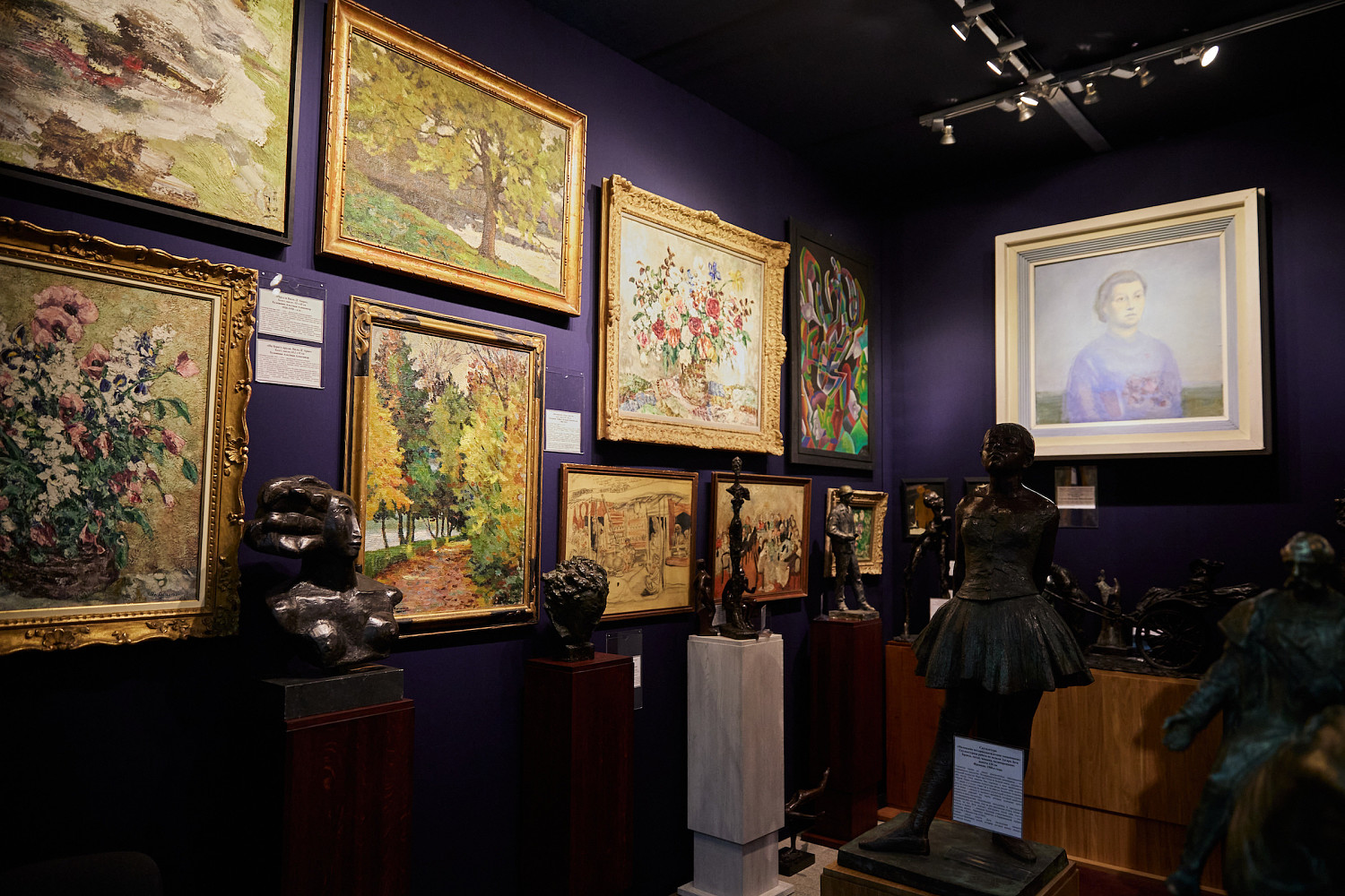 Гости вечера начинали осмотр экспозиции со стендов ведущих антикварных галерей России и частных коллекций, среди которых Suslov Fine Arts, галерея «Петербург», «Элизиум», «Искусство Востока», Антикварный салон «На Кутузовском проспекте, 22–24», «Альтруист» и многие другие. Особым вниманием пользовались произведения Алексея Саврасова, Ивана Айвазовского, Михаила Нестерова, Исаака Левитана, Петра Кончаловского, Давида Бурлюка, Николая Суетина, Александры Экстер и других знаменитых художников.