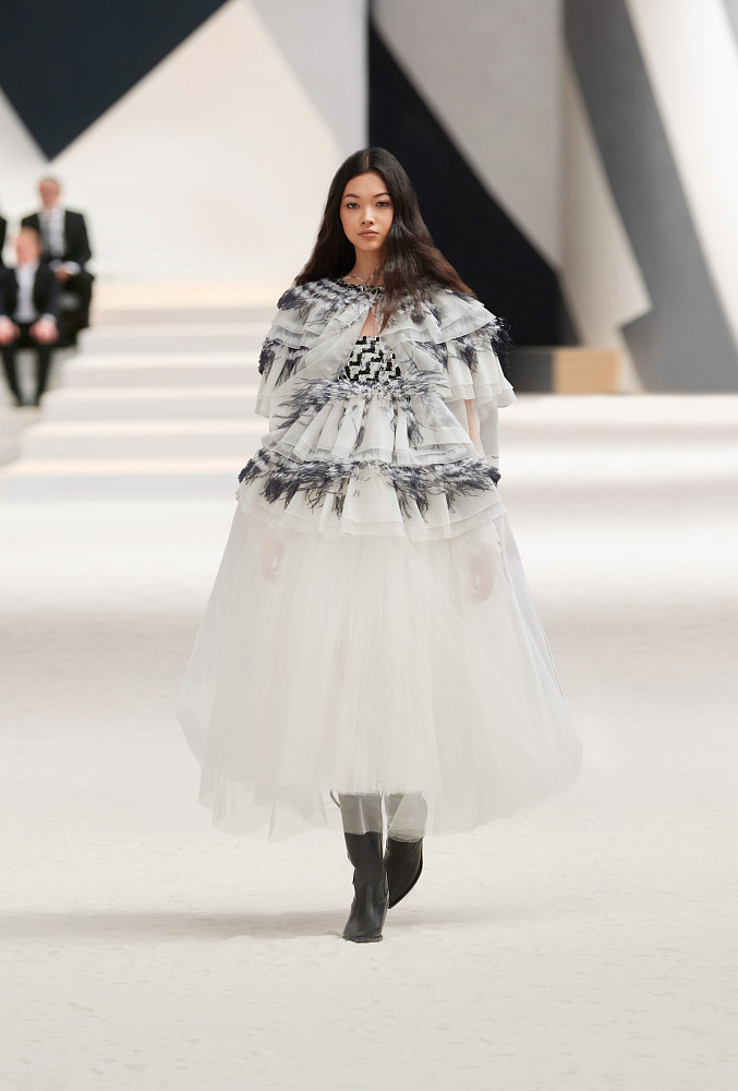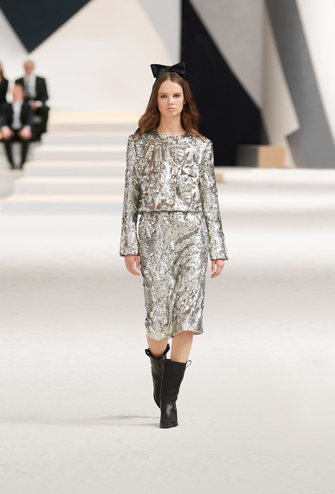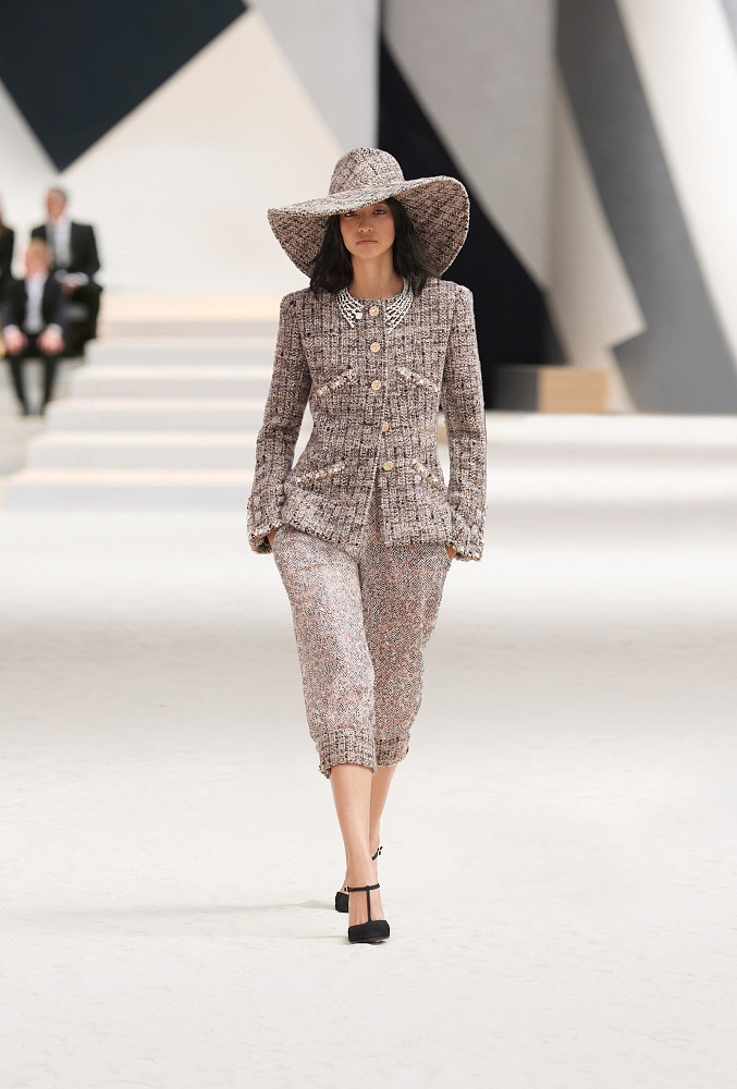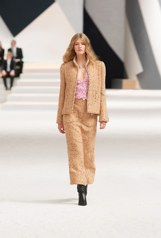 Из юбилейной коллекции High Jewellery «1932», которая отдает дань уважения первой и единственной коллекции Bijoux de Diamants, созданной в 1932 году мадемуазель Шанель, Виржини Виар выбрала ожерелья. Некоторые образы сопровождаются ковбойскими сапогами, что придает изюминку длинным твидовым юбкам, воздушным платьям и создает связь с центром верховой езды Étrier de Paris, местом проведения шоу. «Эти сапоги также перекликаются с предыдущим показом высокой моды, который открылся показом Шарлотты Казираги верхом на лошади», — добавляет Виржини Виар.
