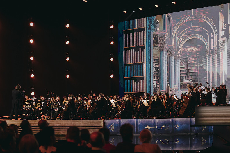 Всего на один вечер сцена площадки превратилась в огромный письменный стол, где в одной части разместился оркестр под руководством художественного руководителя и главного дирижера Государственного Кремлёвского оркестра Константина Чудовского, а вторая часть, в форме открытой книги, стала главным местом единения великолепной музыки, незабываемого танца и будоражащих голосов оперных исполнителей. Дополнительный объем придавало отражение происходящего в трех тоннах воды, окружающих сцену.  А для эффекта всестороннего погружения в атмосферу светского вечера в зале для зрителей распылили нежный и тонкий аромат.