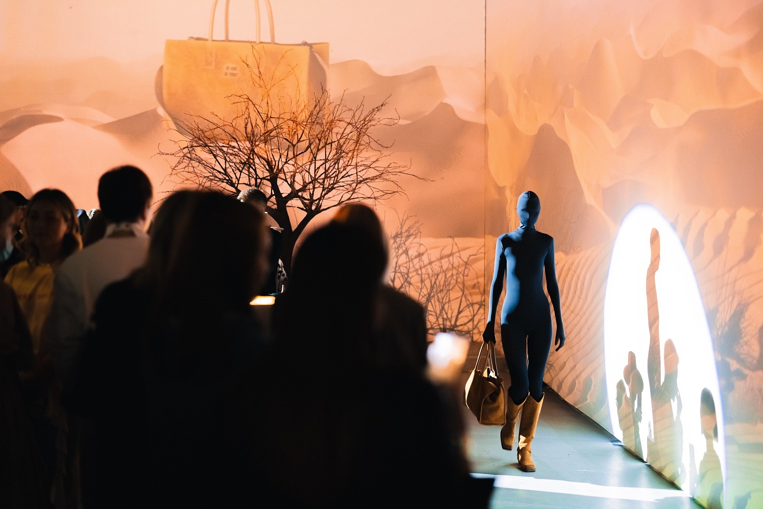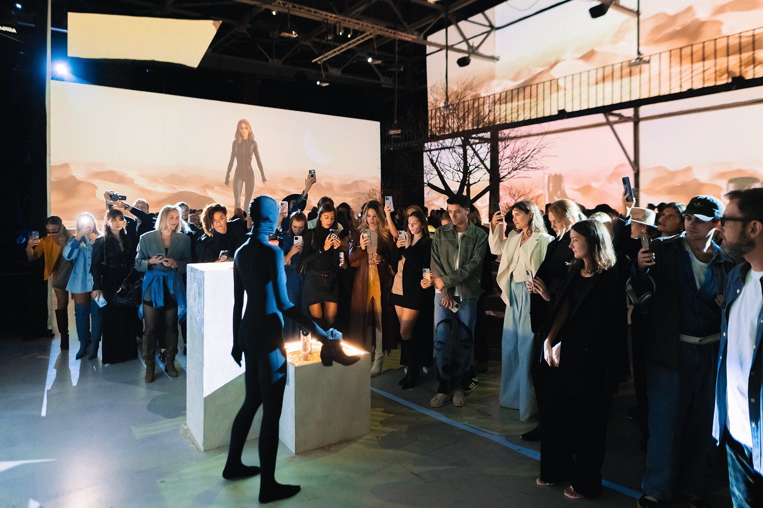 По задумке, презентация коллекции проходила параллельно в двух реальностях — в настоящей и в будущей, которые соединились на время шоу. Глубокому погружению в фантазийную историю способствовали фиджитал-инсталляции и видео-изображения, которые передавались не только на стены, но и на пол и на экраны обратной проекции, визуально изменяющие геометрию зала.