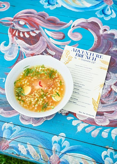 За кухню далеких странствий отвечали именитые шеф-повара Луиджи Маньи (Pinch, Brera) и Георгий Троян («Северяне», Le Pigeon, Blanca), впервые работавшие на одной кухне вместе. Хайлайты меню: гребешок с черешней и авокадо, ризотто с цветками цукини, фирменная Павлова с щавелевым мороженым, и, конечно же, уникальные блюда, разработанные специально для бранча — окрошка на базе безалкогольного пива.