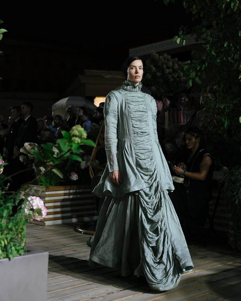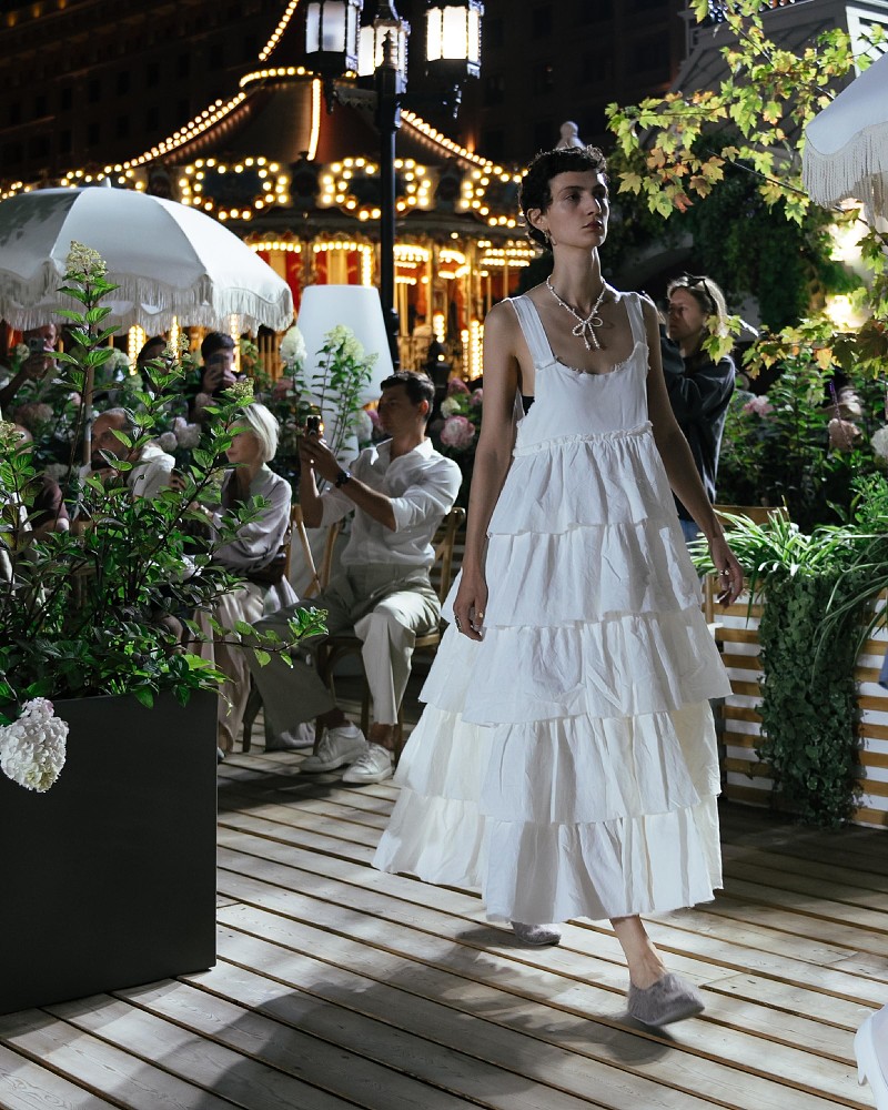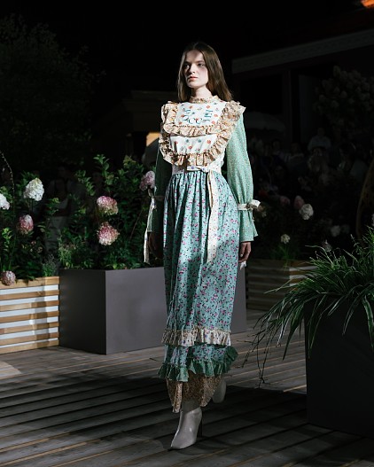 Специально для показа 3/4 на Площади Революции ателье бренда ARTEM KRIVDA создало платье по мотивам картин Ивана Билибина, который был не только художником, но и иллюстратором русской сказки и создателем декораций и костюмов к операм и балету, таким как «Сказка о царе Салтане» и «Жар-птица».